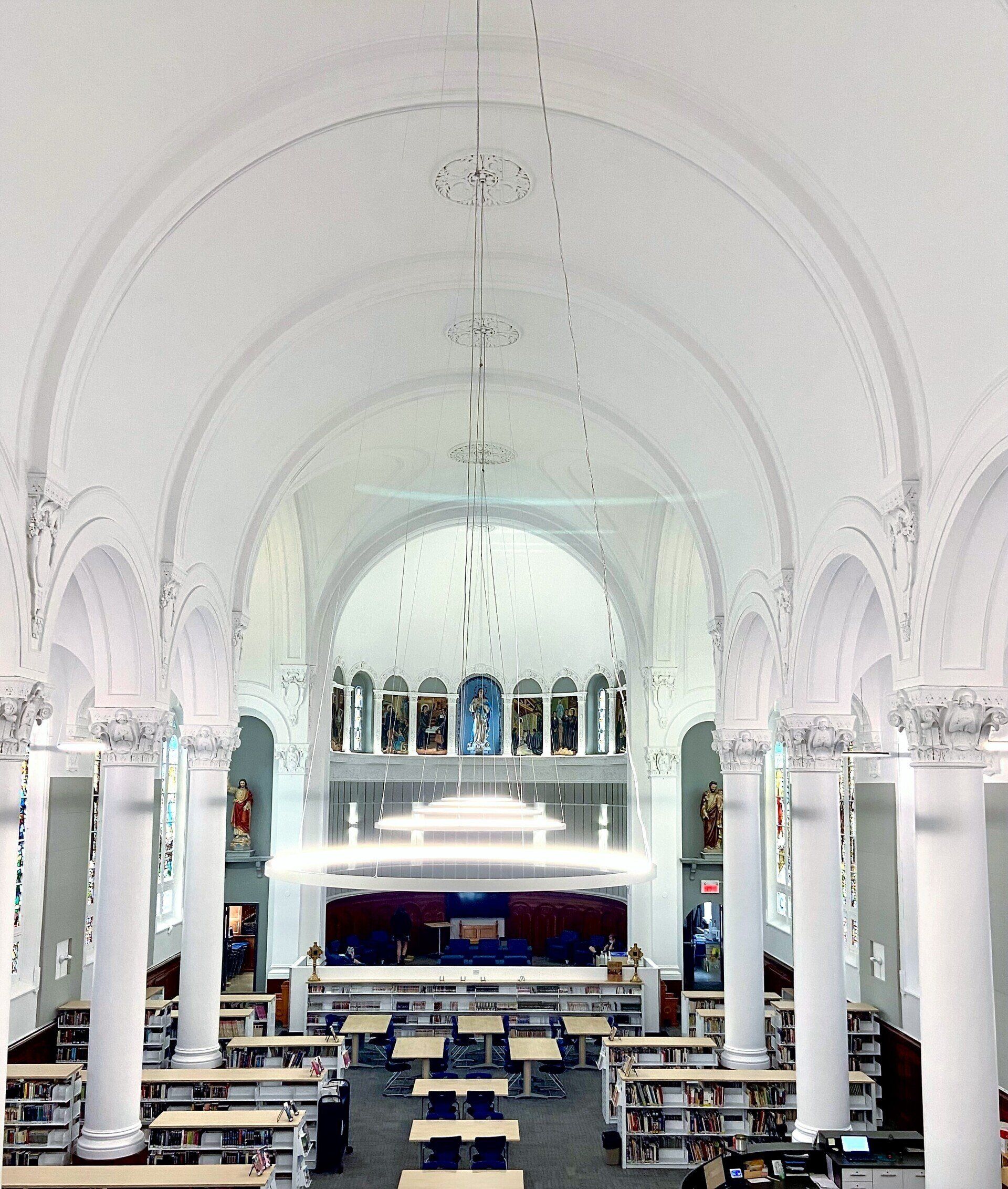 Le but de ce projet était de reconvertir l’ancienne Chapelle qui n’était plus utilisée en tant que telle en une bibliothèque. Il était très important pour notre client de conserver l’histoire du bâtiment c’est pourquoi les éléments de patrimoine existants se mêlent avec les aménagements modernes.